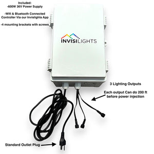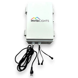 The 36V InvisiLights Controller is the cornerstone of the InvisiLights system, designed to ensure seamless and efficient operation. It includes a 600W 36V power supply, a standard outlet cable, and three lighting output ports, each capable of powering up to 200 feet of lighting before requiring power injection. Additionally, it features a convenient plug-and-play power injection port for installations needing extended runs.